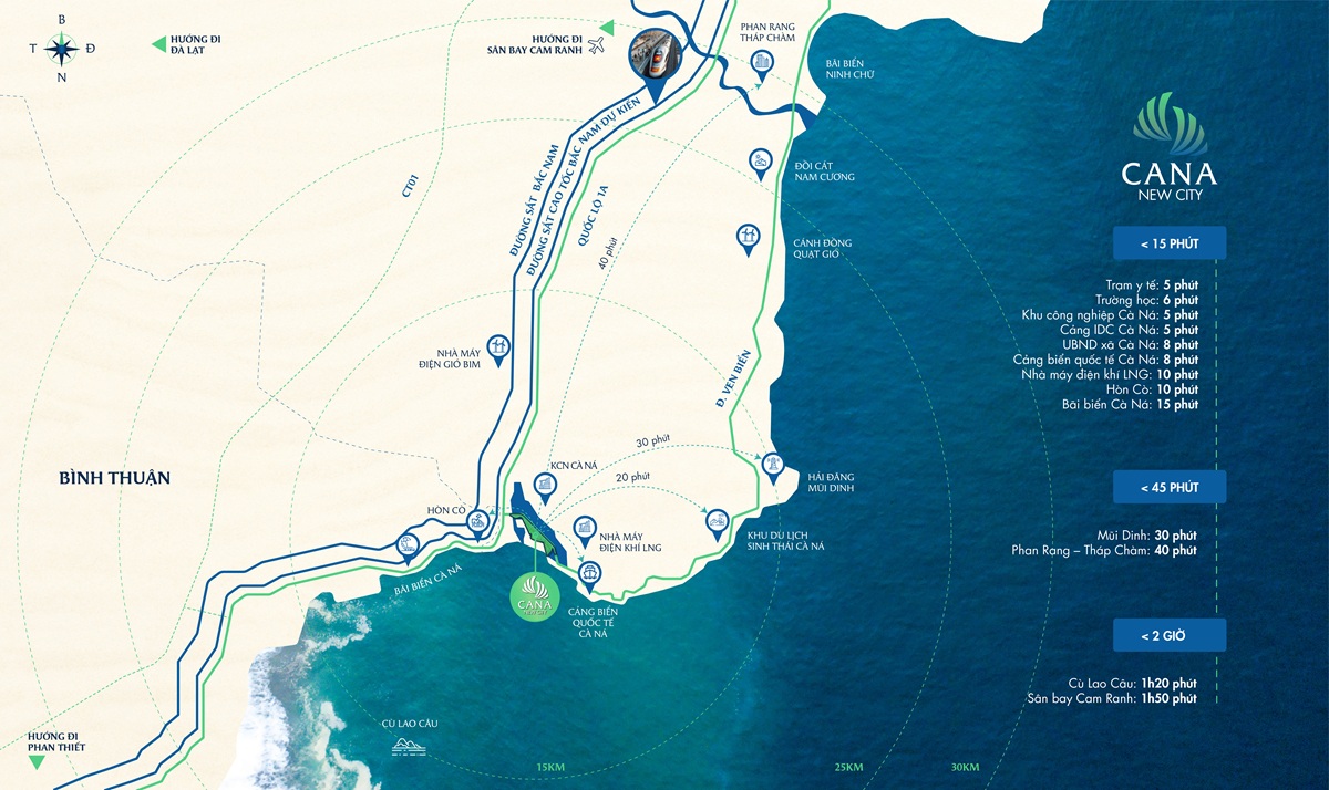 Cana New City nằm giữa vùng dân cư đông đúc. Một bên là Cảng biển tổng hợp Cà Ná – Cảng biển Cà Ná, Khu công nghiệp Cà Ná quy mô lớn đang hình thành. Một bên là các khu tiểu thương, kinh doanh truyền thống như Cánh đồng muối Phước Diêm, Cánh đồng muối Cà Ná. Liền kề với các khu dân cư hiện hữu với hệ thống an sinh xã hội như trường học, trạm y tế UBND, Trường học các cấp v.v…