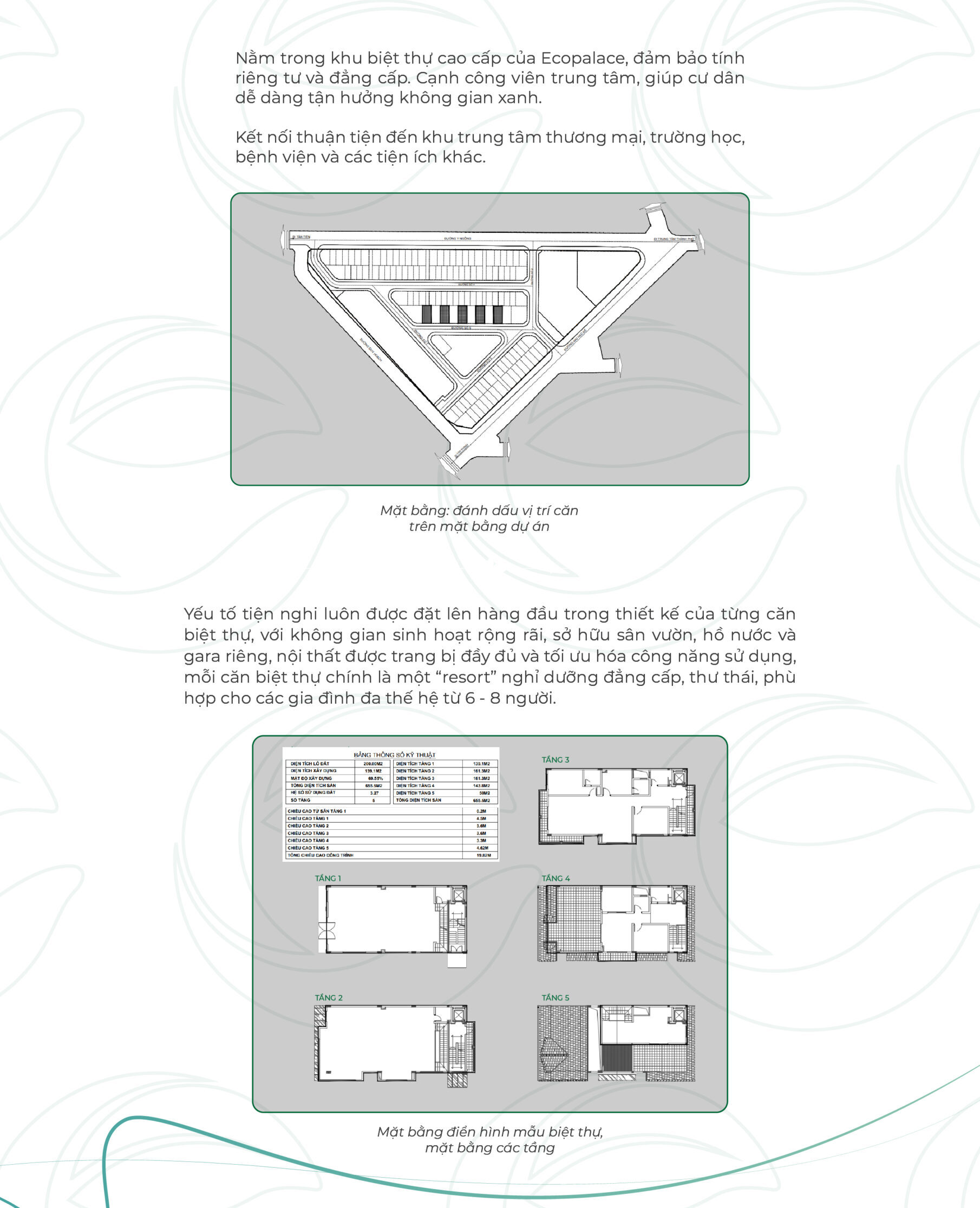 | Mật độ | Chỉ 120 căn nhà ở thấp tầng & 500 căn hộ cao cấp |